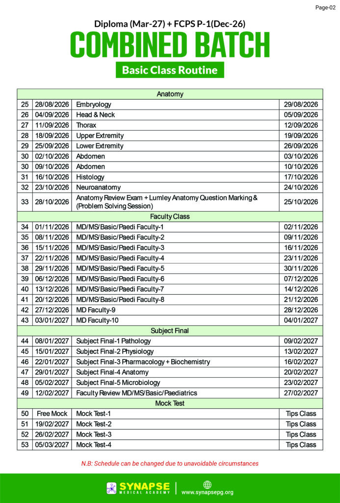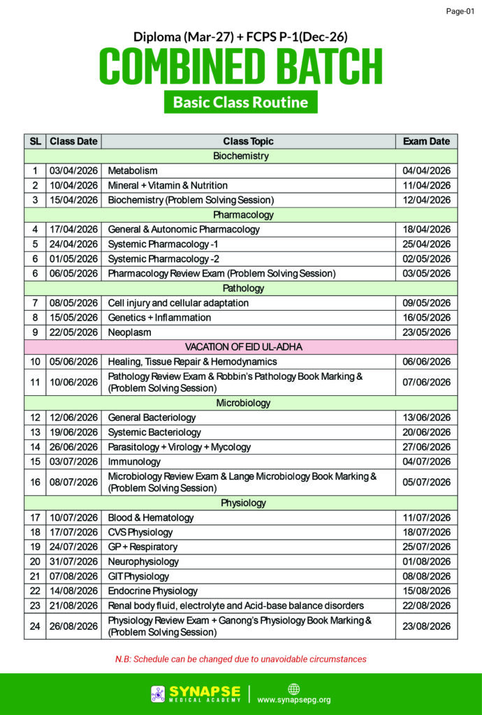 কম্বাইন্ড বেসিক ক্লাস প্রতি শুক্রবার ১টি করে হবে। আগামী মে/জুন মাস থেকে FCPS P-1 ফ্যাকাল্টি ফোকাসড ক্লাস শুরু হবে। প্রতিটি ক্লাস Zoom এ লাইভ হবে। ওয়েবসাইটের মাধ্যমে সকল ক্লাস+এক্সাম রেকর্ডেড এক্সেস Diploma (Mar-2027)  এক্সাম পর্যন্ত থাকবে।Course Features: Diploma + FCPS P-1 Focused