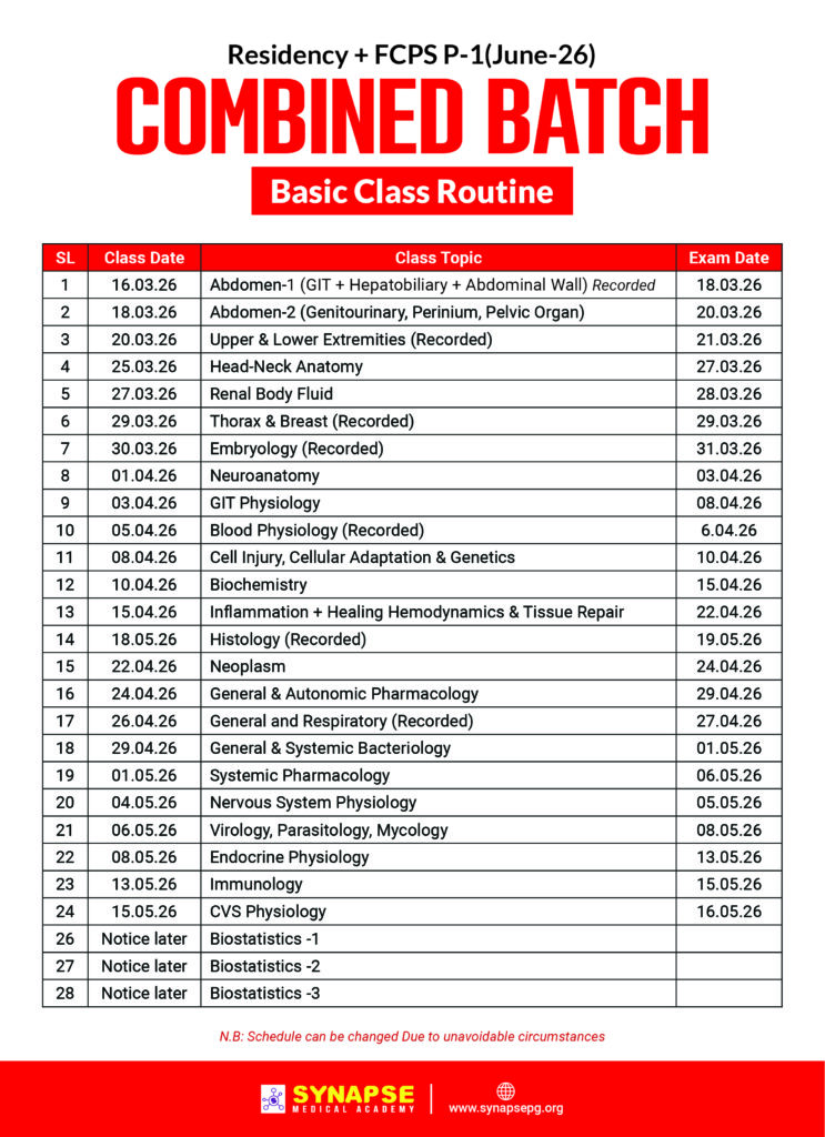 কোর্স প্ল্যানঃ এখন Part-1 এর বেসিক এবং ক্লিনিক্যাল ক্লাস পাবেন। মে/জুন মাস থেকে Residency ক্লাস শুরু হবে। সকল ক্লাস Zoom এ লাইভ হবে। ওয়েবসাইটের মাধ্যমে ক্লাস + এক্সাম রেকর্ডেড এর এক্সেস Residency Exam পর্যন্ত থাকবে।